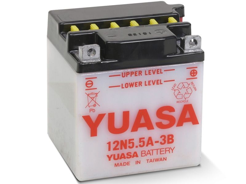 Batería Yuasa 12N5.5A-3B. La batería Yuasa 12N5.5A-3B incluye una resistente malla de fibra de vidrio para evitar daños por vibraciones, un fino separador especial para empaquetar placas adicionales y proporcionar un 30 % más de potencia de arranque que los convencionales, conectores de células a través de las paredes para minimizar la resistencia interna y maximizar la potencia, y protector antisulfato para frenar la sulfatación de las placas y prolongar la vida útil.