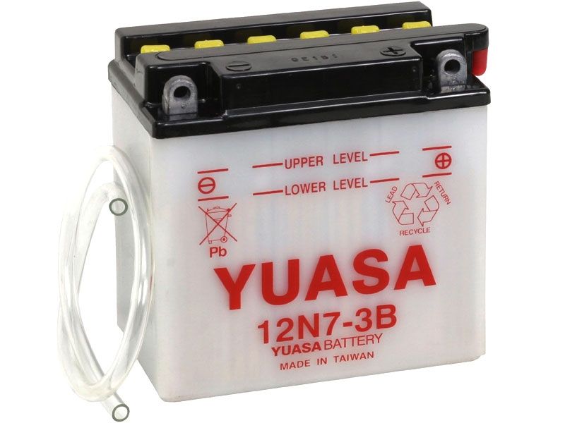 Batería Yuasa 12N7-3B. La batería Yuasa 12N7-3B incluye una resistente malla de fibra de vidrio para evitar daños por vibraciones, un fino separador especial para empaquetar placas adicionales y proporcionar un 30 % más de potencia de arranque que los convencionales, conectores de células a través de las paredes para minimizar la resistencia interna y maximizar la potencia, y protector antisulfato para frenar la sulfatación de las placas y prolongar la vida útil.