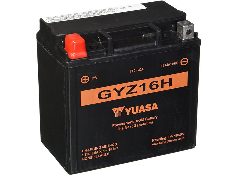 Batería Yuasa GYZ16H. La batería Yuasa GYZ16H de elevadas prestaciones, aporta un 30 % más de amperios de arranque, gracias a su diseño radial y a placas adicionales. Yuasa significa más potencia, menos mantenimiento y mayor duración. La batería Yuasa GYZ16H MF High Performance (libre de ácido) está diseñada para durar hasta 3 veces más que las bateriás convencionales. La resistencia excepcional a la vibración hace de Yuasa la batería más fiable del mercado actual.