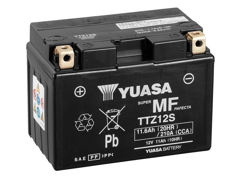 Batería moto Yuasa TTZ12S / TTZ12S-BS. La batería Yuasa TTZ12S / TTZ12S-BS está dotada del sistema VRLA (valve Regulated Lead Acid) totalmente hermética, por lo que no necesita ser rellenada. Mantiene el voltaje más tiempo y necesita menos recarga en tiempo de espera y de almacenamiento. La batería Yuasa TTZ12S / TTZ12S-BSS posee un diseño a prueba de derrames, significa que virtualmente no hay la posibilidad de fugas e incrementa la potencia de arranque. El retardandate de sulfatación reduce notablemente la sulfatación de las placas, alargando la vida de la batería. La resistencia excepcional a la vibración hace de Yuasa la batería más fiable del mercado actual.