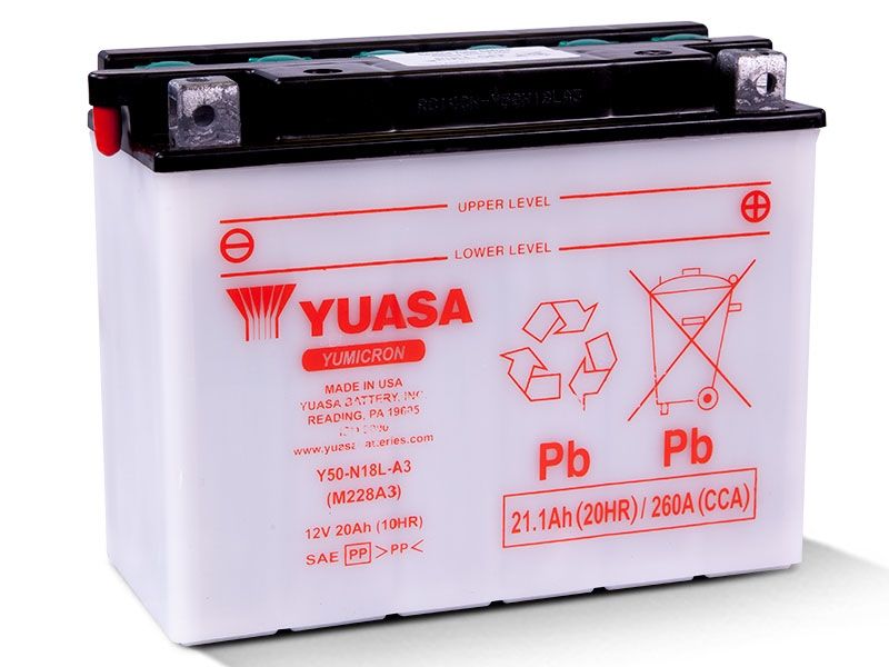 Batería Yuasa Y50-N18L-A3 YuMicron. La batería YuMicron Yuasa Y50-N18L-A3 incluye una resistente malla de fibra de vidrio para evitar daños por vibraciones, un fino separador especial para empaquetar placas adicionales y proporcionar un 30 % más de potencia de arranque que los convencionales, conectores de células a través de las paredes para minimizar la resistencia interna y maximizar la potencia, y protector antisulfato para frenar la sulfatación de las placas y prolongar la vida útil.