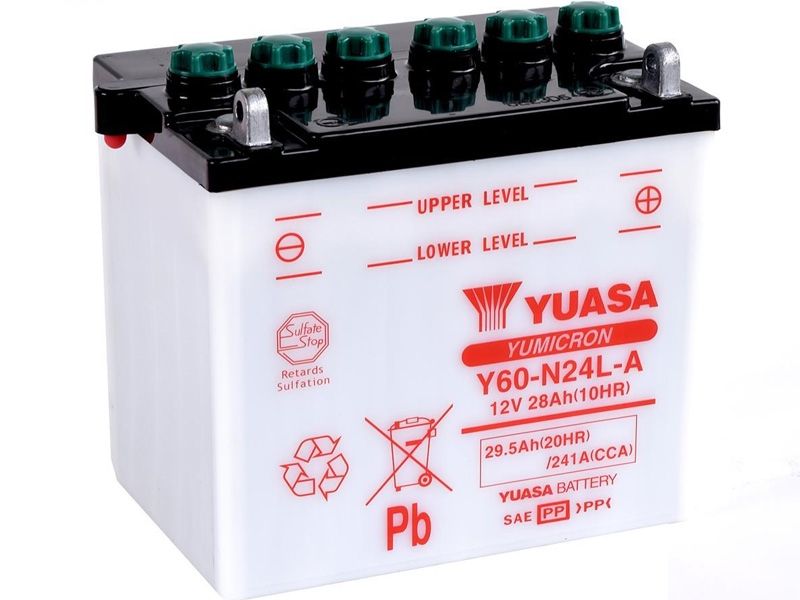 Batería Yuasa Y60-N24L-A YuMicron. La batería YuMicron Yuasa Y60-N24L-A incluye una resistente malla de fibra de vidrio para evitar daños por vibraciones, un fino separador especial para empaquetar placas adicionales y proporcionar un 30 % más de potencia de arranque que los convencionales, conectores de células a través de las paredes para minimizar la resistencia interna y maximizar la potencia, y protector antisulfato para frenar la sulfatación de las placas y prolongar la vida útil.