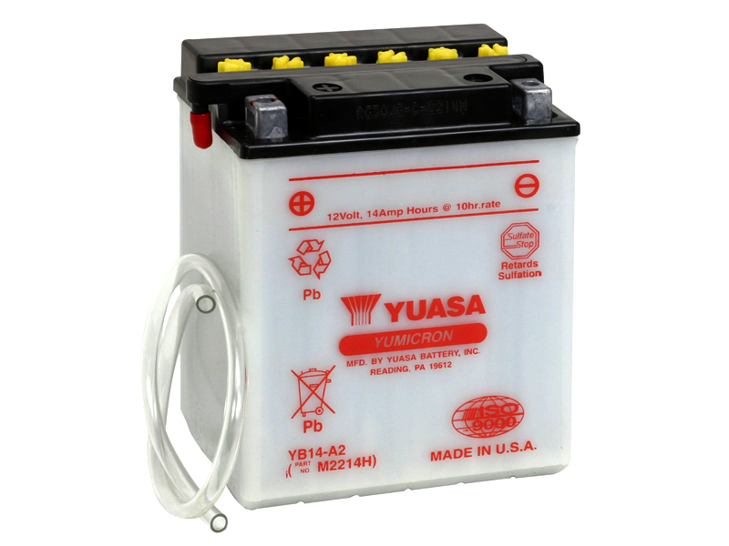 Batería Yuasa YB14-A2 YuMicron. La batería YuMicron Yuasa YB14-A2 incluye una resistente malla de fibra de vidrio para evitar daños por vibraciones, un fino separador especial para empaquetar placas adicionales y proporcionar un 30 % más de potencia de arranque que los convencionales, conectores de células a través de las paredes para minimizar la resistencia interna y maximizar la potencia, y protector antisulfato para frenar la sulfatación de las placas y prolongar la vida útil. La batería YB14-A2 no incluye el ácido.