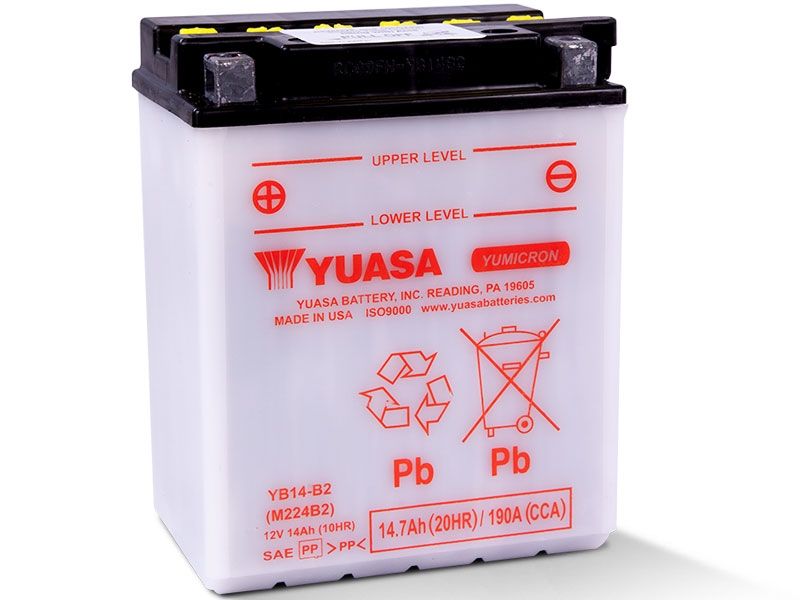 Batería Yuasa YB14-B2 YuMicron. La batería YuMicron Yuasa YB14-B2 incluye una resistente malla de fibra de vidrio para evitar daños por vibraciones, un fino separador especial para empaquetar placas adicionales y proporcionar un 30 % más de potencia de arranque que los convencionales, conectores de células a través de las paredes para minimizar la resistencia interna y maximizar la potencia, y protector antisulfato para frenar la sulfatación de las placas y prolongar la vida útil.