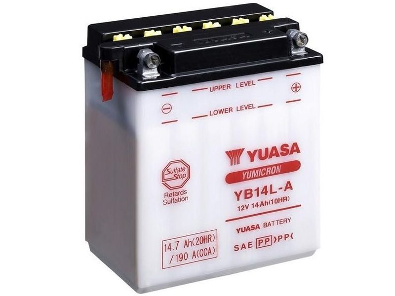 Batería Yuasa YB14L-A YuMicron. La batería YuMicron Yuasa YB14L-A incluye una resistente malla de fibra de vidrio para evitar daños por vibraciones, un fino separador especial para empaquetar placas adicionales y proporcionar un 30 % más de potencia de arranque que los convencionales, conectores de células a través de las paredes para minimizar la resistencia interna y maximizar la potencia, y protector antisulfato para frenar la sulfatación de las placas y prolongar la vida útil.