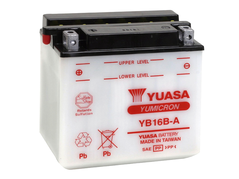 Batería Yuasa YB16B-A YuMicron. La batería YuMicron Yuasa YB16B-A incluye una resistente malla de fibra de vidrio para evitar daños por vibraciones, un fino separador especial para empaquetar placas adicionales y proporcionar un 30 % más de potencia de arranque que los convencionales, conectores de células a través de las paredes para minimizar la resistencia interna y maximizar la potencia, y protector antisulfato para frenar la sulfatación de las placas y prolongar la vida útil. La batería YB16B-A no incluye el ácido.