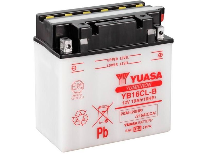 Batería Yuasa YB16CL-B Combipack (con electrolito). La batería YuMicron Yuasa YB16CL-B incluye una resistente malla de fibra de vidrio para evitar daños por vibraciones, un fino separador especial para empaquetar placas adicionales y proporcionar un 30 % más de potencia de arranque que los convencionales, conectores de células a través de las paredes para minimizar la resistencia interna y maximizar la potencia, y protector antisulfato para frenar la sulfatación de las placas y prolongar la vida útil.