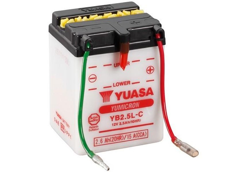 Batería Yuasa YB2.5L-C YuMicron. La batería YuMicron Yuasa YB2.5L-C incluye una resistente malla de fibra de vidrio para evitar daños por vibraciones, un fino separador especial para empaquetar placas adicionales y proporcionar un 30 % más de potencia de arranque que los convencionales, conectores de células a través de las paredes para minimizar la resistencia interna y maximizar la potencia, y protector antisulfato para frenar la sulfatación de las placas y prolongar la vida útil.