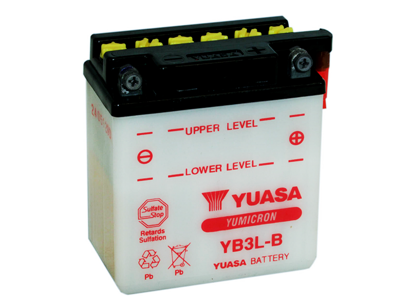 Batería Yuasa YB3L-B YuMicron. La batería YuMicron YB3L-B incluye una resistente malla de fibra de vidrio para evitar daños por vibraciones, un fino separador especial para empaquetar placas adicionales y proporcionar un 30 % más de potencia de arranque que los convencionales, conectores de células a través de las paredes para minimizar la resistencia interna y maximizar la potencia, y protector antisulfato para frenar la sulfatación de las placas y prolongar la vida útil. La batería Yuasa YB3L-B no incluye el ácido.