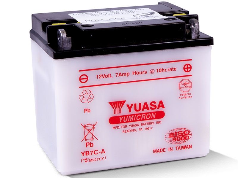 Batería Yuasa YB7C-A YuMicron. La batería YuMicron Yuasa YB7C-A incluye una resistente malla de fibra de vidrio para evitar daños por vibraciones, un fino separador especial para empaquetar placas adicionales y proporcionar un 30 % más de potencia de arranque que los convencionales, conectores de células a través de las paredes para minimizar la resistencia interna y maximizar la potencia, y protector antisulfato para frenar la sulfatación de las placas y prolongar la vida útil.