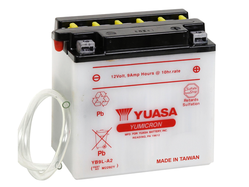 Batería Yuasa YB9L-A2 YuMicron. La batería YuMicron YB9L-A2 incluye una resistente malla de fibra de vidrio para evitar daños por vibraciones, un fino separador especial para empaquetar placas adicionales y proporcionar un 30 % más de potencia de arranque que los convencionales, conectores de células a través de las paredes para minimizar la resistencia interna y maximizar la potencia, y protector antisulfato para frenar la sulfatación de las placas y prolongar la vida útil. La batería Yuasa YB9L-A2 incluye el ácido por separado.