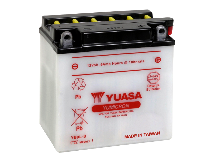Batería Yuasa YB9L-B YuMicron. La batería YuMicron YB9L-B incluye una resistente malla de fibra de vidrio para evitar daños por vibraciones, un fino separador especial para empaquetar placas adicionales y proporcionar un 30 % más de potencia de arranque que los convencionales, conectores de células a través de las paredes para minimizar la resistencia interna y maximizar la potencia, y protector antisulfato para frenar la sulfatación de las placas y prolongar la vida útil. La batería Yuasa YB9L-B no incluye el ácido.
