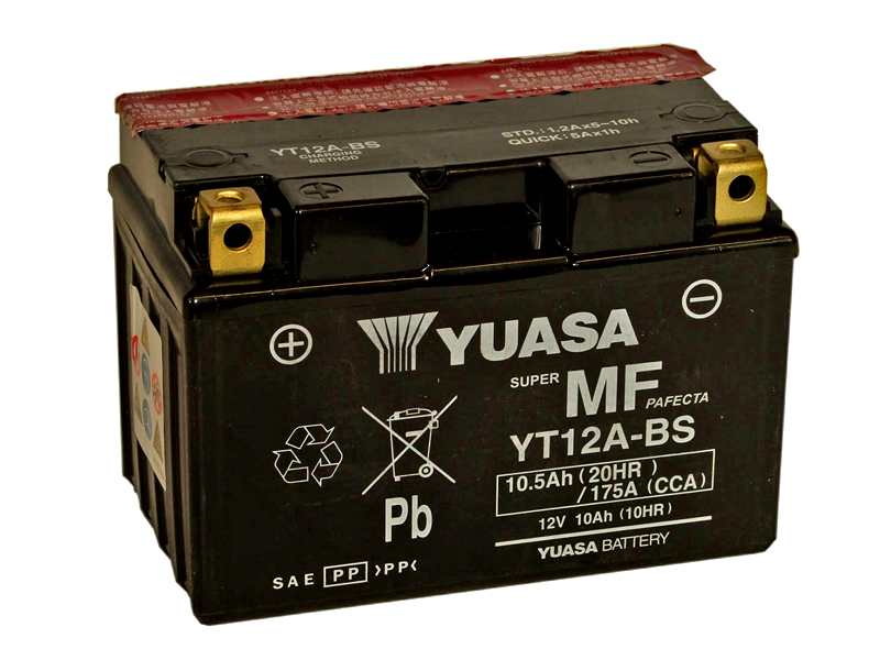Batería Yuasa YT12A-BS. La batería Yuasa YT12A-BS está dotada del sistema VRLA (valve Regulated Lead Acid) totalmente hermética, por lo que no necesita ser rellenada. Mantiene el voltaje más tiempo y necesita menos recarga en tiempo de espera y de almacenamiento. La batería Yuasa YT12A-BS posee un diseño a prueba de derrames, significa que virtualmente no hay la posibilidad de fugas e incrementa la potencia de arranque. El retardandate de sulfatación reduce notablemente la sulfatación de las placas, alargando la vida de la batería. La resistencia excepcional a la vibración hace de Yuasa la batería más fiable del mercado actual.
