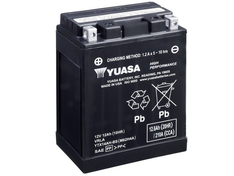 Batería Yuasa YTX14AH-BS High Performance Maintenance Free. La batería Yuasa YTX14AH-BS es totalmente hermética, por lo que no necesita ser rellenada. Mantiene el voltaje más tiempo y necesita menos recarga en tiempo de espera y de almacenamiento. La batería Yuasa YTX14AH-BS posee un diseño a prueba de derrames, significa que virtualmente no hay la posibilidad de fugas e incrementa la potencia de arranque.
