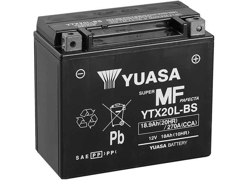 Batería Yuasa YTX20L-BS. La batería Yuasa YTX20L-BS está dotada del sistema VRLA (valve Regulated Lead Acid) totalmente hermética, por lo que no necesita ser rellenada. Mantiene el voltaje más tiempo y necesita menos recarga en tiempo de espera y de almacenamiento. La batería Yuasa YTX20L-BS posee un diseño a prueba de derrames, significa que virtualmente no hay la posibilidad de fugas e incrementa la potencia de arranque. El retardandate de sulfatación reduce notablemente la sulfatación de las placas, alargando la vida de la batería. La resistencia excepcional a la vibración hace de Yuasa la batería más fiable del mercado actual.