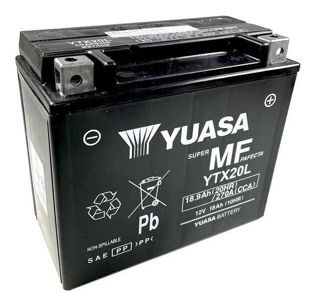Batería Yuasa YTX20L-WC Precargada. La batería Yuasa YTX20L-WC precargada de serie está dotada del sistema VRLA (valve Regulated Lead Acid) totalmente hermética, por lo que no necesita ser rellenada. Mantiene el voltaje más tiempo y necesita menos recarga en tiempo de espera y de almacenamiento. La batería Yuasa YTX20L-WC posee un diseño a prueba de derrames, significa que virtualmente no hay la posibilidad de fugas e incrementa la potencia de arranque. El retardandate de sulfatación reduce notablemente la sulfatación de las placas, alargando la vida de la batería. La resistencia excepcional a la vibración hace de Yuasa la batería más fiable del mercado actual. La diferencia entre la batería Yuasa YTX20L-WC con respecto a la batería YTX20L-WC es que viene ya con el ácido añadido y activada de serie por el propio fabricante.