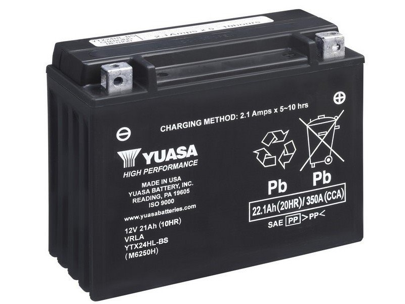 Batería Yuasa YTX24HL-BS. La batería Yuasa YTX24HL-BS está dotada del sistema VRLA (valve Regulated Lead Acid) totalmente hermética, por lo que no necesita ser rellenada. Mantiene el voltaje más tiempo y necesita menos recarga en tiempo de espera y de almacenamiento. La batería Yuasa YTX24HL-BS posee un diseño a prueba de derrames, significa que virtualmente no hay la posibilidad de fugas e incrementa la potencia de arranque. El retardandate de sulfatación reduce notablemente la sulfatación de las placas, alargando la vida de la batería. La resistencia excepcional a la vibración hace de Yuasa la batería más fiable del mercado actual.
