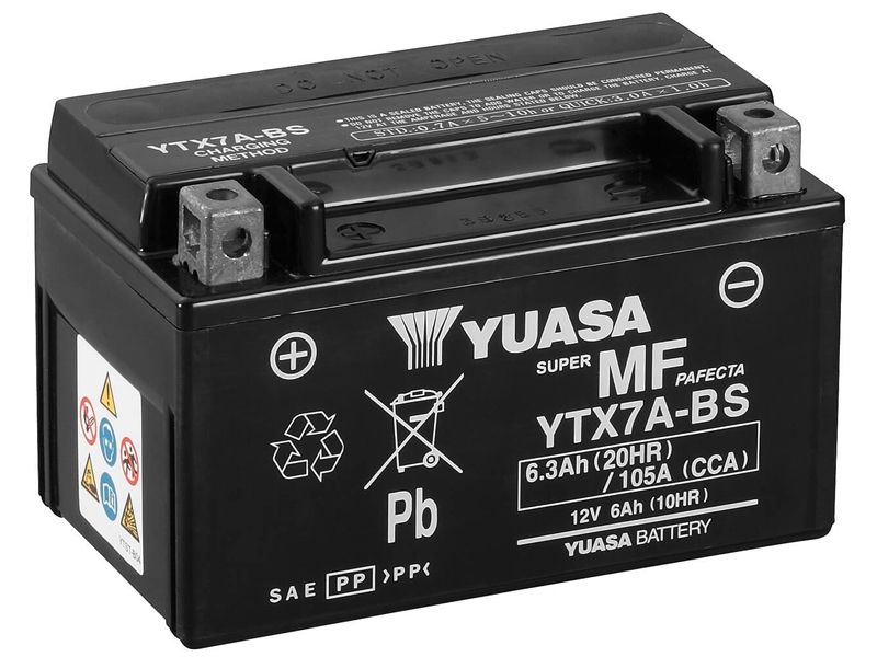 Batería Yuasa YTX7A-BS. La batería Yuasa YTX7A-BS está dotada del sistema VRLA (valve Regulated Lead Acid) totalmente hermética, por lo que no necesita ser rellenada. Mantiene el voltaje más tiempo y necesita menos recarga en tiempo de espera y de almacenamiento. La batería Yuasa YTX7A-BS posee un diseño a prueba de derrames, significa que virtualmente no hay la posibilidad de fugas e incrementa la potencia de arranque. El retardandate de sulfatación reduce notablemente la sulfatación de las placas, alargando la vida de la batería. La resistencia excepcional a la vibración hace de Yuasa la batería más fiable del mercado actual.