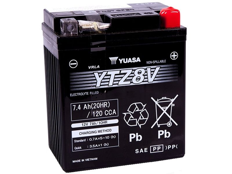 Batería Yuasa YTZ8V. La batería Yuasa YTZ8V de elevadas prestaciones, aporta un 30 % más de amperios de arranque, gracias a su diseño radial y a placas adicionales. Yuasa significa más potencia, menos mantenimiento y mayor duración. La batería Yuasa YTZ8V MF High Performance (libre de ácido) está diseñada para durar hasta 3 veces más que las bateriás convencionales. La resistencia excepcional a la vibración hace de Yuasa la batería más fiable del mercado actual.