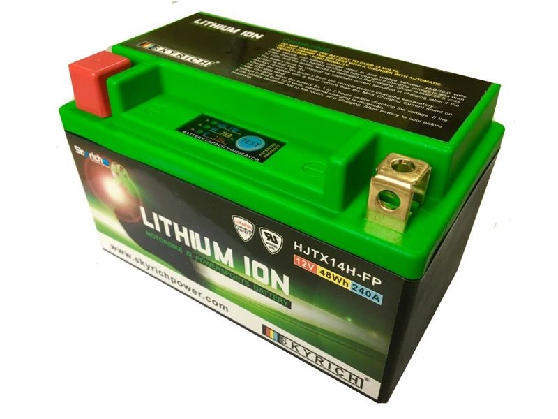 Batería litio Skyrich HJTX14H-FP. La batería de litio para moto Skyrich HJTX14H-FP está diseñada con la mejor tecnología del momento. No es de extrañar que fabricantes de primer nivel como son Ktm, Husqvarna y Ducati las utilicen como equipamiento de serie en algunos de sus modelos de moto. Skyrich diseña y fabrica baterías con tecnología propia patentada, ofreciendo un producto muy seguro, que no contamina y con una potencia superior a la de las baterías convencionales.