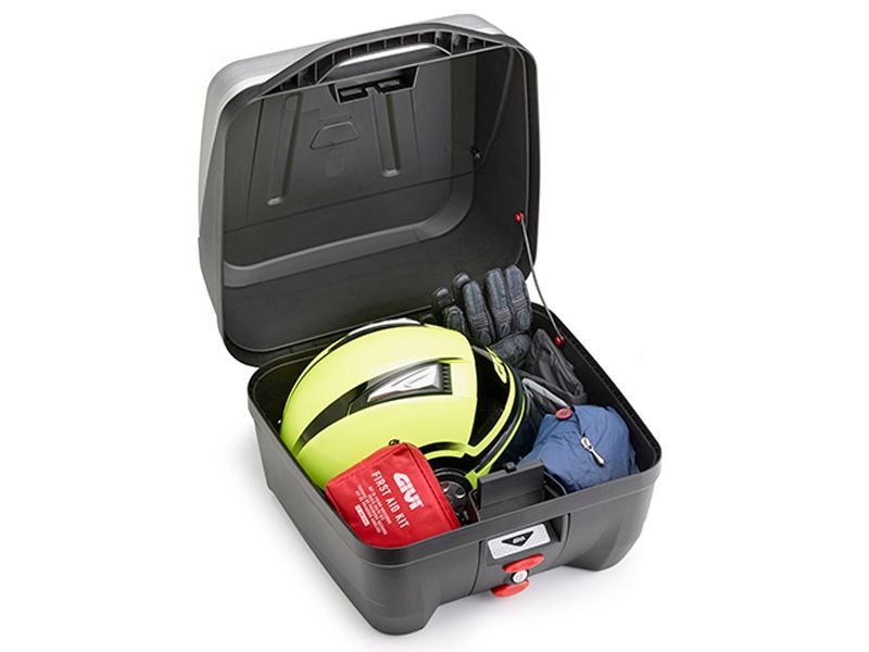 Baúl Givi B32 Bold B32N. Nueva maleta universal Givi B32 Bold con sistema Monolock y 32 litros de capacidad. Ideal para scooters de pequeña y mediana cilindrada, la B32 cuenta con un bonito embellecedor central de color plata satinado. Pese a tener 32 litros de capacidad, este elegante baúl permite albergar 1 casco modular. Incluye kit y parrilla universal. No compatible con la parrilla Monolock MM. Capacidad de 32 litros. Medidas: 303 mm (alto) x 405 mm (ancho) x 443 mm (profundo). Carga máxima de 3 kg.