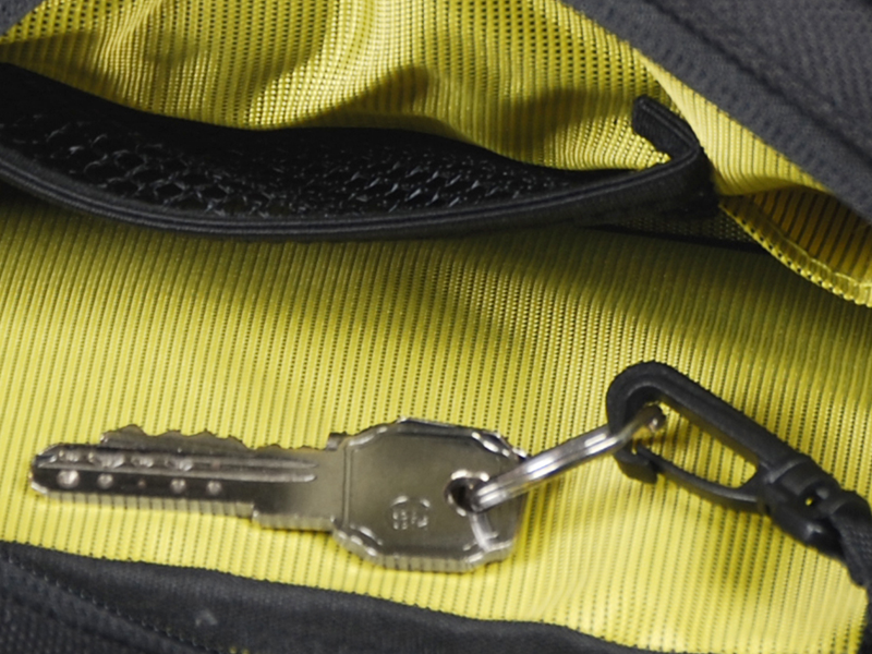 - Compartimento principal: con mosquetón para llaves, 3 porta bolígrafos y un compartimento de malla con cierre elástico.