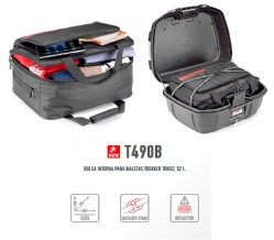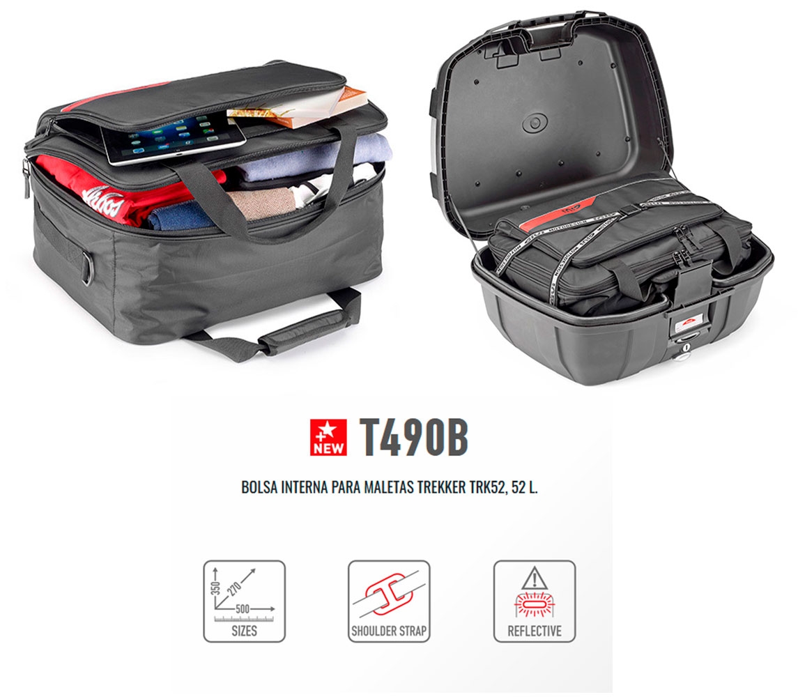 Bolsa interna Givi T490B para maletas Trekker TRK52. La bolsa interior Givi T490B se puede utilizar sólo en las maletas Givi Trekker TRK52. Incluye un bolsillo externo para portátil de hasta 15 pulgadas. La bolsa Givi T490B es muy versátil ya que se puede utilizar también fuera de la moto, gracias a las prácticas asas que permiten un confortable transporte manual.