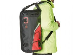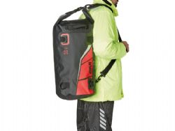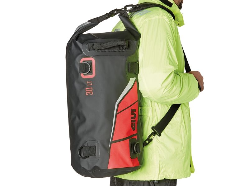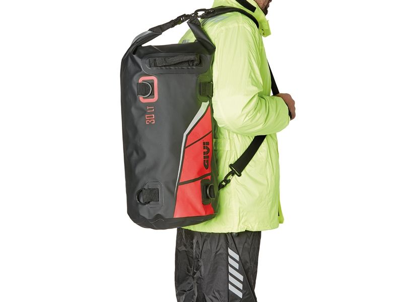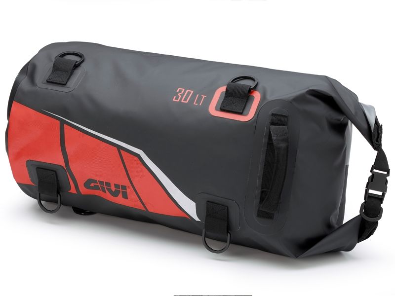 Bolsa sillín Givi EA114BR Negro / Rojo (Línea Easy-T Range). Bolsa de sillín Givi EA114 con diseño cilíndrico y capacidad total de 30 litros. Su construcción en PVC Tarpaulin con soldaduras a alta frecuencia (sin costuras) y su cierre enrollable, garantizan la total impermeabilidad.