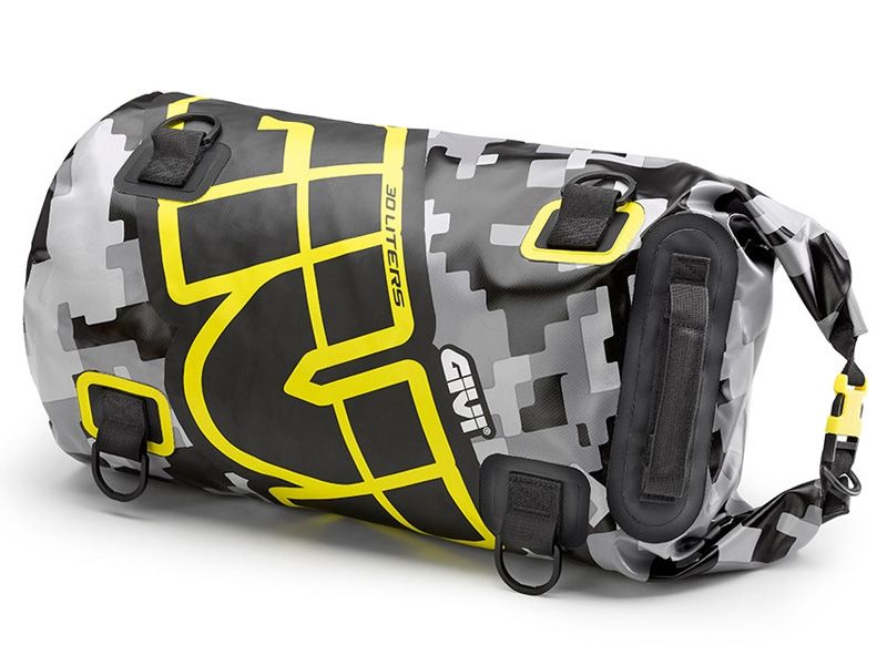 Bolsa sillín Givi EA114CM Camuflaje (Línea Easy-T Range). Bolsa de sillín Givi EA114 con diseño cilíndrico y capacidad total de 30 litros. Su construcción en PVC Tarpaulin con soldaduras a alta frecuencia (sin costuras) y su cierre enrollable, garantizan la total impermeabilidad.