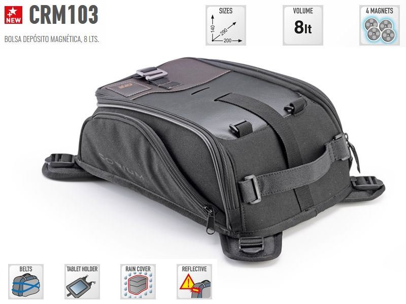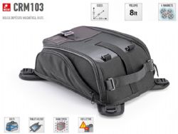 Bolsa sobredeposito Givi CRM103 Corium. Bolsa de depósito universal Givi CRM103 Corium con fijación magnética mediante 4 imanes. Ofrece una capacidad de 8 litros y un diseño perfecto para motos de estilo retro o café racer. Realizada con materiales durables, la bolsa Givi CRM103 además incorpora una práctica funda impermeable para proteger el contenido interior en los días de lluvia.