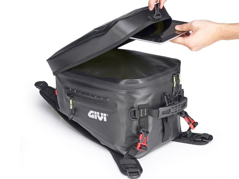 Bolsa depósito Givi GRT715. Bolsa de depósito universal Givi GRT715 impermeable con 20 litros de capacidad. Esta nueva versión incorpora el interior de color amarillo. Dotada de base específica para enganche / desenganche rápido, la bolsa Givi GRT715 está realizada en Nylon 840D TPU de doble revestimiento con soldadura de alta frecuencia para una impermeabilidad total.