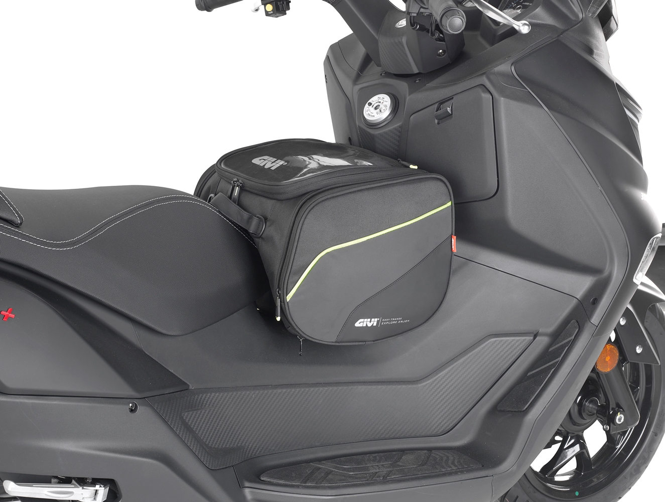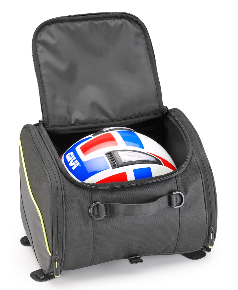 Bolsa túnel/sillín Givi EA136 Línea Easy. Bolsa universal Givi EA136 (Línea Easy-T) para colocar en scooters tanto en el túnel como el sillín. Confeccionada en tejido altamente resistente 600D PU reflectante negro mate con refuerzos en la zona inferior. Esta bolsa es muy amplia ya que ofrece una capacidad total de 23 litros. Todos los materiales con los que está realizada la bolsa Givi EA136 cumplen con la normativa Europea Reach n. 1907/2006. La bolsa Givi EA136 se fija al scooter mediante correas y enganches ocultos en los bolsillos laterales.