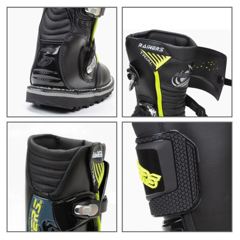 Botas Trial Rainers 3040-MR Marrón (modelo renovado 2021). Botas diseñadas para la competición de Trial y confeccionadas en piel flor hidrófuga. Las botas Rainers 3040-MR disponen de protectores de TPU además de puntos de flexión de microfibra de alta resistencia para hacer esta bota más cómoda y duradera. El forro interior es de tejido de alta resistencia. La suela de goma ha sido especialmente diseñada para mejorar el agarre además de estar pegada y cosida a la bota para hacerla más resistente.