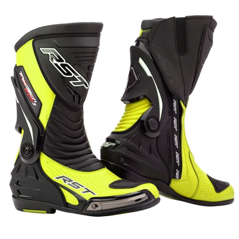 Botas RST Tractech Evo 3 Sport Amarillo. Las nuevas botas RST Tractech Evo III Sport están diseñadas para una conducción deportiva cómoda y segura. Ofrecen excelente confort, gracias a los amplios paneles de piel acordeón. Estos paneles están ubicados en la zona delantera de la bota para ofrecer mayor movilidad, tanto encima de la moto como fuera de ella. La nueva suela resistente al desgaste, está unida al talón y este a su vez unida al tobillo para así poder evitar la extensión del mismo. La protección de la tibia ha sido rediseñada para ofrecer una protección extra contra a los impactos.