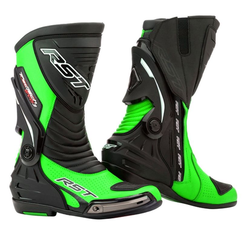 Botas RST Tractech Evo 3 Sport Verde Flúor. Las nuevas botas RST Tractech Evo III Sport están diseñadas para una conducción deportiva cómoda y segura. Ofrecen excelente confort, gracias a los amplios paneles de piel acordeón. Estos paneles están ubicados en la zona delantera de la bota para ofrecer mayor movilidad, tanto encima de la moto como fuera de ella. La nueva suela resistente al desgaste, está unida al talón y este a su vez unida al tobillo para así poder evitar la extensión del mismo. La protección de la tibia ha sido rediseñada para ofrecer una protección extra contra a los impactos.