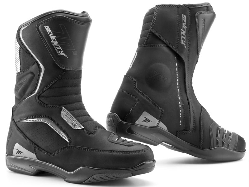 Botas Seventy Degrees SD-BT3 Negras. Elegantes botas de turismo de caña media caracterizadas por ofrecer una excelente calidad y comodidad. Confeccionadas en piel con acabado PU y nylon, las botas Botas Seventy Degrees SD-BT3 incorporan la eficaz membrana impermeable WinterTex y forro de malla suave de poliéster micro-transpirable para un óptimo confort. Estas botas homologadas disponen de protecciones estratégicamente ubicadas además de un sistema de cierre diseñado para ofrecer un gran ajuste al pie.