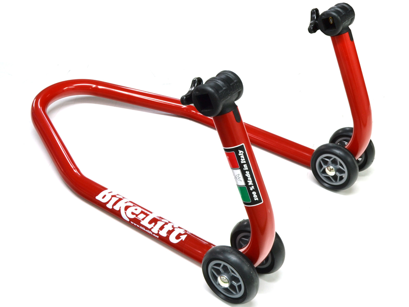 Caballete Delantero Bike Lift FS-10 Regulable Universal Sin Soportes. Caballete delantero a la horquilla. Fabricado en tubo de acero de una sola pieza de Ø35 mm, pintado de rojo especial a base de polvo de poliéster. Incluye 4 ruedas de nylon de Ø90mm para situar fácilmente el caballete en el vehiculo. Es el elegido por mecánicos y pilotos de todo el mundo. Altura: 32 cm.