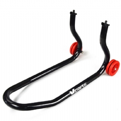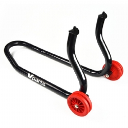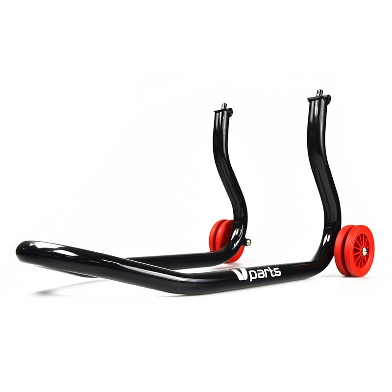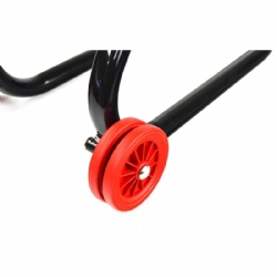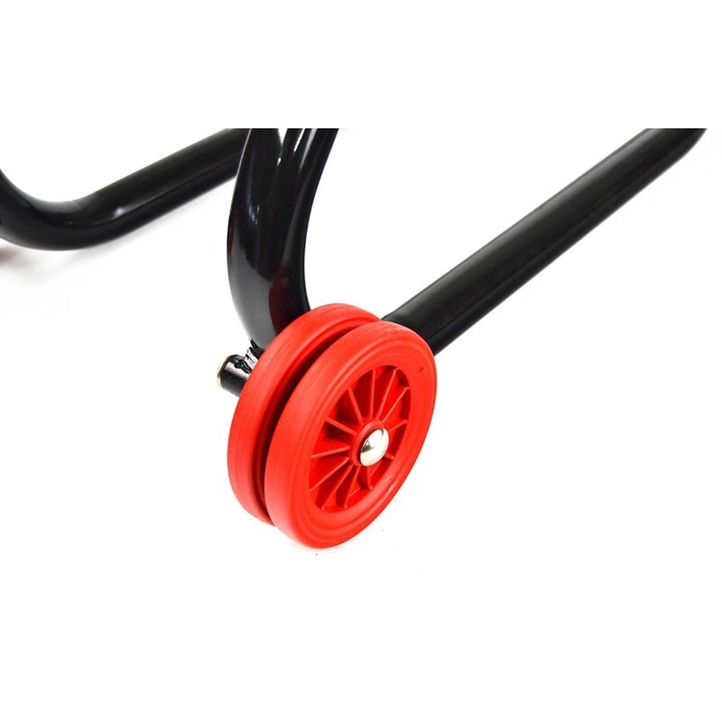 Caballete delantero moto BIHR 1112900 horquillas perforadas negro con ruedas rojas. El caballete delantero BIHR 1112900 es una herramienta indispensable para cuidar y mantener tu moto, tanto en el garaje como en el paddock. Diseñado específicamente para motos con horquillas perforadas, este caballete garantiza una elevación segura y precisa de la rueda delantera.