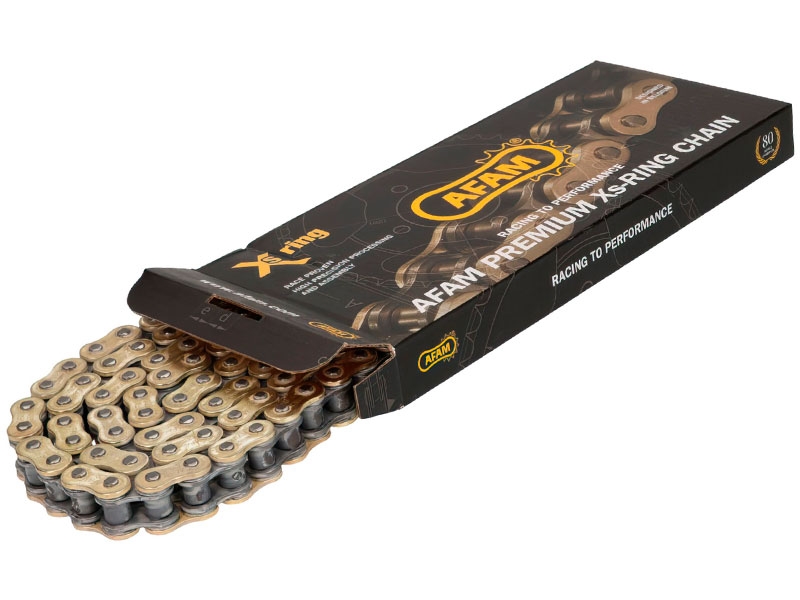 Cadena Afam 520 XRR3-G Oro 118 Pasos. La cadena para moto Afam XRR3 cuenta con el sellado Xs Ring y se caracteriza por ofrecer una buena relación calidad-precio. La cadena Afam XXR3 ofrece mayor resistencia a la tracción con excelente durabilidad para uso off-road o fuera pista en motos con cilindradas comprendidas entre los 125 y 500cc. Tipo de cierre con eslabón sólido remachado. Adjuntamos un catálogo de cadenas para moto Afam donde podrás encontrar información más detallada de todos los productos.