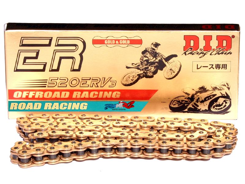 Cadena DID 415ER 110 eslabones oro. Cadenas diseñada especialmente para carreras gracias a su elevado rendimiento. La cadena DID 415 ER se caracteriza por su ligerara y por la baja fricción que ofrece. proporcionando la mayor resistencia al desgaste, resistencia a la tracción y resistencia al impacto existentes en el mercado. La cadena ER está indicada para motos de 125cc con máximo.