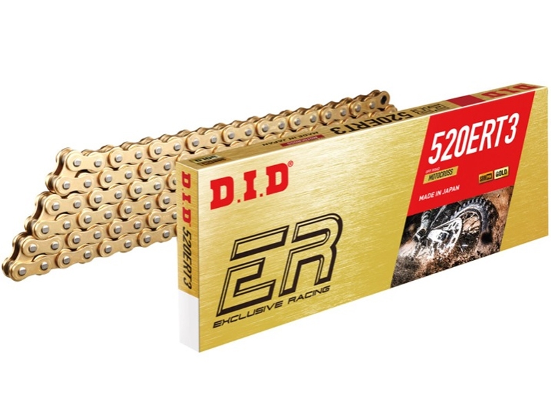 Cadena DID 520ERT3 086 eslabones oro. Cadena de motocross desarrollada con las colaboración de los equipos del mundial de motocross. La cadena Did ERT3 ofrece un 25% más de rendimiento antichoque y un 5% más de resistencia a la tracción que el modelo anterior y además sin aumentar su peso. La cadena Did ofrece excelente relación calidad-precio.