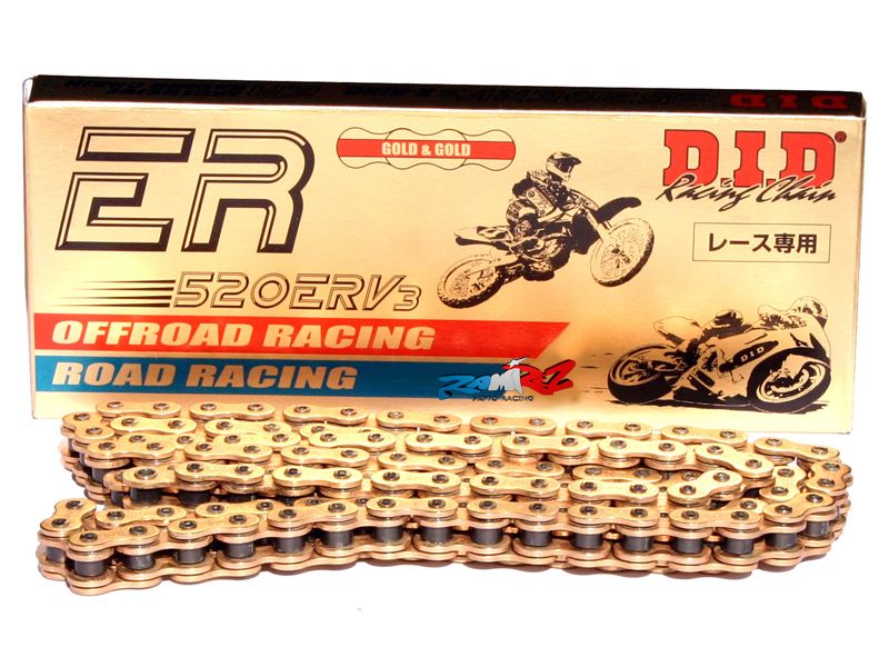 Cadena DID 520ERV3 142 eslabones oro. Se trata de la cadena gama alta de DID y utiliza el equipo de Yamaha MotoGP. La cadena 520ERV3 posee 4 puntos de contacto X-Rings (aros en X) patentados por DID diseñado para incrementar notablemente la capacidad de sellado. Con ello se impiden la entrada de suciedad y la salida del lubricante. Esta cadena aporta mayor resistencia al desgaste que el resto de cadenas.