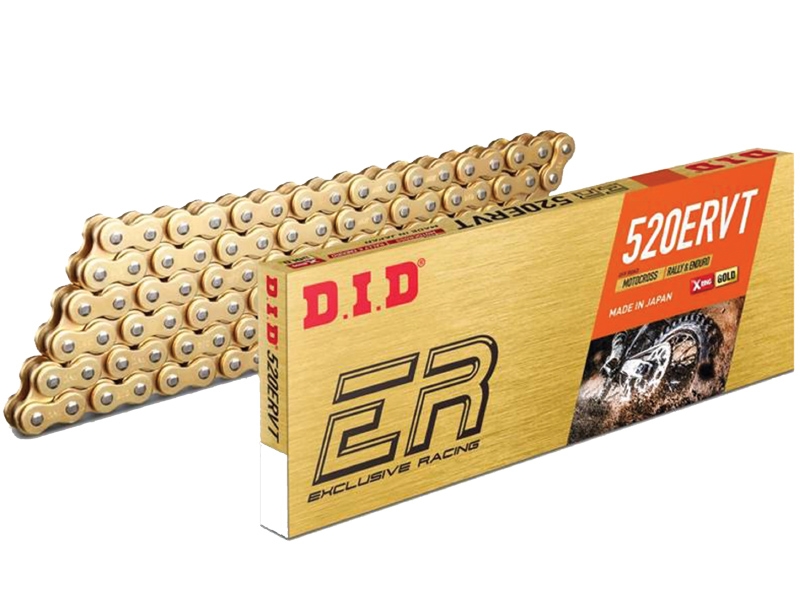 Cadena DID 520ERVT 140 eslabones oro. ERVT es la cadena X-Ring más ligera y resistente de la gama DID con paso 520. Con un diseño que deriva de la cadena original de motocross DID sin retenes, la nueva ERVT posee la tecnología exclusiva X-Ring que garantiza un estiramiento inferior y mayor resistencia a la tracción, para en definitiva, ofrecer una cadena con mayor durabilidad. Sin duda, la DID 520ERVT es la cadena de competición definitiva.