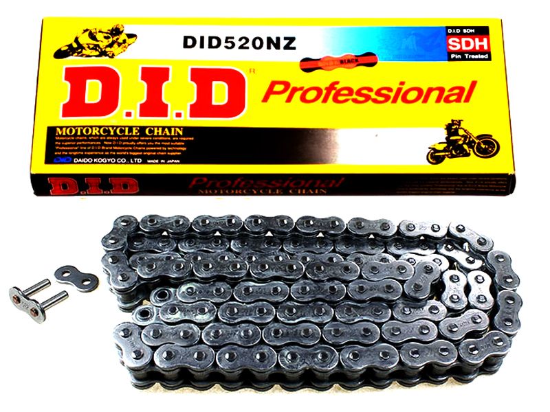 Cadena DID 520NZ 130 eslabones negro. Cadena DID NZ de paso 520 tratada con el sistema SDH de DID, que aporta a la superficie de los eslabones una capa de carburo de cromo de extrema dureza, manteniendo una suave estructura interna y otorgándole propiedades anti-oxidación. Cierre con clip, aunque con opción de remache.