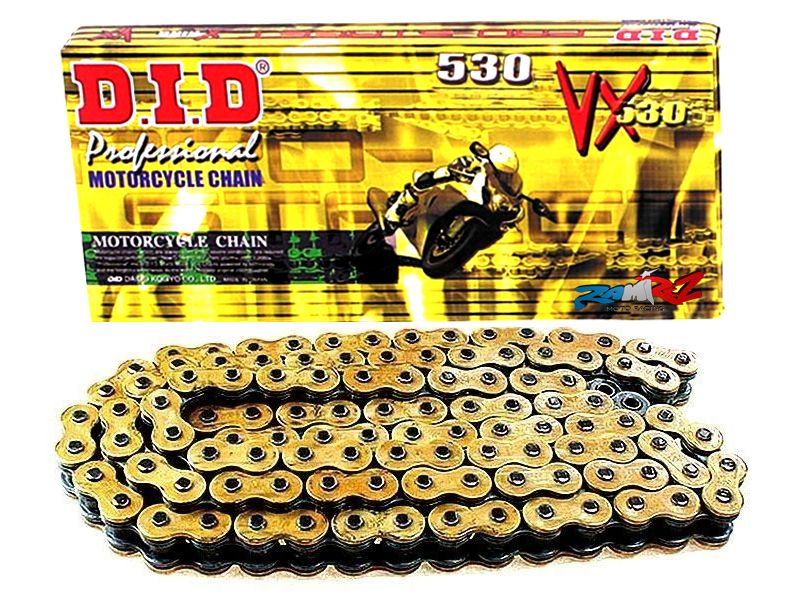 Cadena DID 530VX 130 eslabones oro. La cadena DID VX X-Ring posee una resistencia al desgaste excepcional. El sistema de sellado X-Ring con cuatro puntos de contacto (Aros en X) y patentados por DID, incrementan enormemente la capacidad de sellado, impiden la entrada de suciedad y la salida del lubricante es mucho mayor que en cualquier otra cadena de moto. Además, las cadenas con X-Ring tienen mayor resistencia al desgaste que el resto de cadenas. La construcción de las cadenas DID con sistema X-Ring garantizan una reducción de la fricción ya que su acción de giro distribuye la presión y minimiza la pérdida de potencia. El cierre se realiza mediante remache.