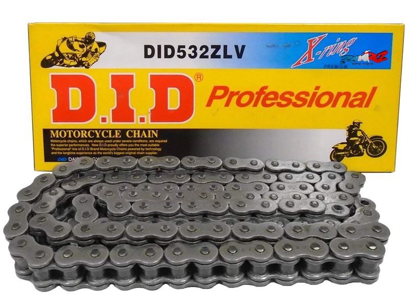 Cadena DID 532ZLV 144 eslabones negro. La cadena DID 532ZLV posee una resistencia al desgaste excepcional. El sistema de sellado X-Ring con cuatro puntos de contacto (Aros en X) y patentados por DID, incrementan enormemente la capacidad de sellado, impiden la entrada de suciedad y la salida del lubricante es mucho mayor que en cualquier otra cadena de moto. Además, las cadenas con X-Ring tienen mayor resistencia al desgaste que el resto de cadenas. La construcción de las cadenas DID con sistema X-Ring garantizan una reducción de la fricción ya que su acción de giro distribuye la presión y minimiza la pérdida de potencia. El cierre se realiza mediante remache.