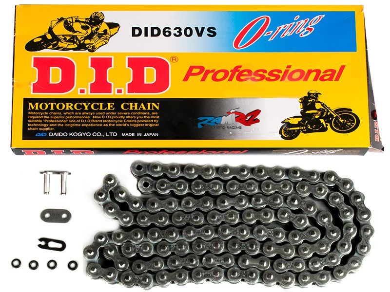 Cadena DID 630V 084 eslabones negro. Cadena DID con paso 630 perteneciente a la serie Professional O-Ring. Esta cadena ofrece un elevado rendimiento, gracias a su construcción con casquillos sólidos que a su vez le confiere una vida útil más larga que la mayoría de cadenas de paso 630.
