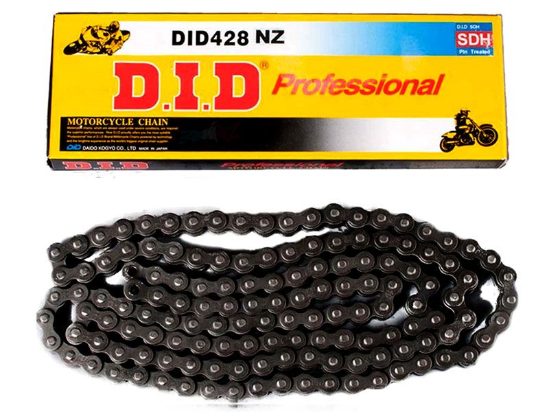 Cadena Did 428 NZ X 132 FB Negro. Cadena D.I.D en paso 428 diseñada para motos de calle de entre 50 y 125 cc, y motos de cross de entre 50 y 100 c.c. Tratada con el sistema SDH de D.I.D que aporta a la superficie de los eslabones una capa de carburo de cromo de extrema dureza. Esta cadena mantiene una suave estructura interna y posee propiedades anti-oxidación. El sistema de cierre se realiza mediante clip.