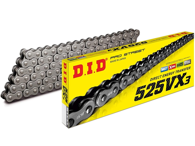 Cadena Did 525VX3 ZB 114 eslabones negro. Nueva cadena DID 525VX3 con retenes y juntas tóricas de anillo X de baja fricción. La nueva cadena DID 525VX3 cubre una gama más amplia de motocicletas (max 1000cc) y ofrece una vida más larga que el modelo anterior. También ha mejorado la transferencia de potencia a la rueda trasera y la rigidez general de la cadena para ayudar a reducir la flexión del pasador y garantizar una conducción más suave.