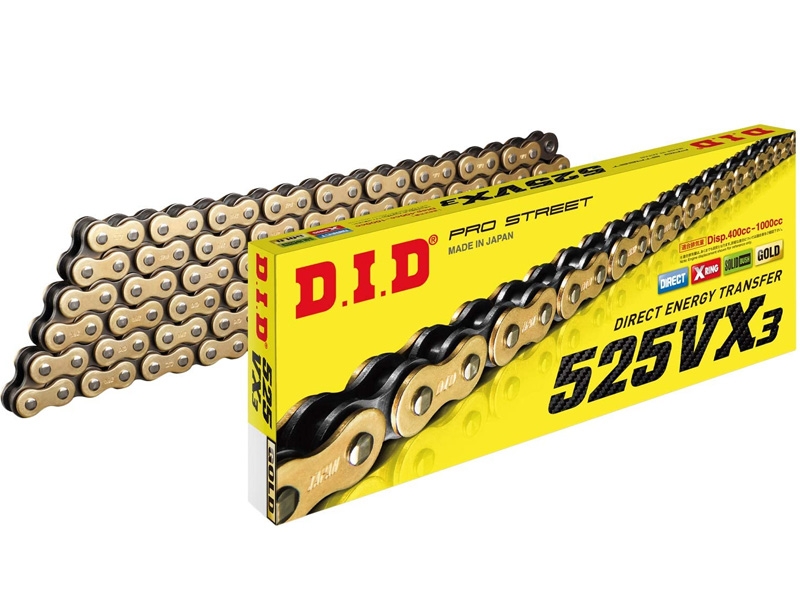 Cadena Did 525VX3 ZB 116 eslabones oro. Nueva cadena DID 525VX3 con retenes y juntas tóricas de anillo X de baja fricción. La nueva cadena DID 525VX3 cubre una gama más amplia de motocicletas (max 1000cc) y ofrece una vida más larga que el modelo anterior. También ha mejorado la transferencia de potencia a la rueda trasera y la rigidez general de la cadena para ayudar a reducir la flexión del pasador y garantizar una conducción más suave.